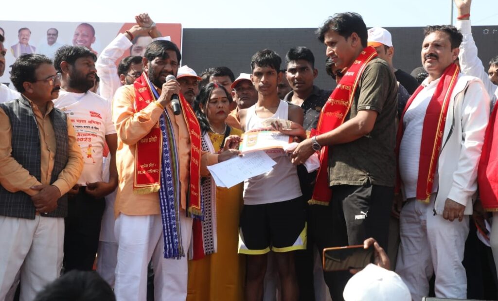लखनऊ । उत्तर प्रदेश की राजधानी लखनऊ में नशामुक्त भारत अभियान के तहत विकसित भारत और आत्मनिर्भर भारत बनाने के उदद्ेश्य से स्वर्गीय आकाश किशोर उर्फ जैबी की पुण्यतिथि पर 19 अक्टूबर को लखनऊ में 22 किलोमीटर की नशामुक्त हॉफ मैराथन संपन्न हुयी। इस नशामुक्त हाफ मैराथन का आयोजन नशा मुक्त समाज आंदोलन अभियान कौशल का… के तहत केंद्रीय राज्य मंत्री कौशल किशोर द्वारा किया गया। दुबग्गा चौराहा में केंद्रीय राज्यमंत्री कौशल किशोर, अंतरराष्ट्रीय धाविका पदमश्री सुधा सिंह, बॉलीवुड एक्टर राजा बुंदेला, विधायक जय देवी कौशल, विधायक राजेश्वर सिंह, विधायक योगेश शुक्ला, विधायक अमरेश रावत, महापौर सुषमा खर्कवाल, एमएलसी पवन सिंह व अन्य गणमान्य जनों द्वारा हरी झंडी दिखाकर नशामुक्त हॉफ मैराथन की शुरुआत की गयी। नशामुक्त हाफ मैराथन में सहारनपुर निवासी प्रिंस कुमार प्रथम विजेता बने और हाथरस निवासी दिनेश द्वितीय विजेता व लखनऊ निवासी बलराम तृतीय विजेता बने। मैराथन में 7 हजार से ज्यादा युवाओं ने प्रतिभाग किया। दुबग्गा चौराहा से शुरू हुई यह नशामुक्त हॉफ मैराथन भिठौली तिराहा होते हुये वापस दुबग्गा चौराहा में समापन हुयी। इसके दोनों तरफ भारी संख्या में लोगों का हुजूम रहा जो नशे के खिलाफ दौड़ रहे युवाओं का हौसला अफजाई कर रहे थे। नशामुक्त हॉफ मैराथन का समापन समारोह जोगर्स पार्क के पास संपन्न हुआ जहां विजेताओं को पुरस्कृत और सम्मानित किया गया।